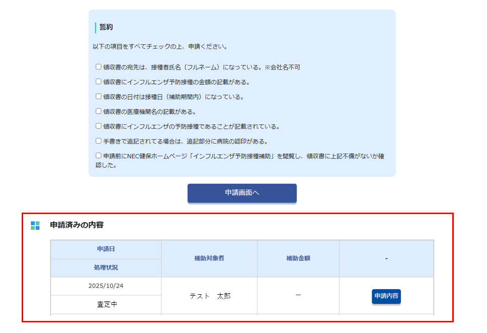 また、申請登録完了後、誓約欄の下側に「申請済みの内容」が表示されます。